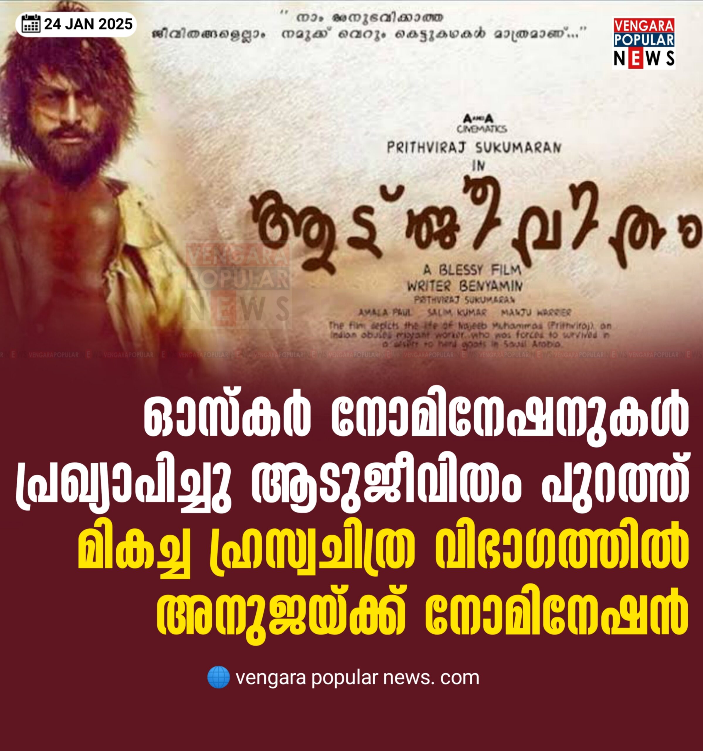 മികച്ച ഹ്രസ്വചിത്ര വിഭാഗത്തിൽ അനുജയ്ക്ക് നോമിനേഷൻ കാലിഫോർണിയ: 97-ാമത് ഓസ്കര് നോമിനേഷനുകള് പ്രഖ്യാപിച്ചു. ആടുജീവിതം, ഓൾ വി ഇമാജിൻ ആസ് ലൈറ്റ്, കങ്കുവ, സ്വതന്ത്രവീർ സവര്ക്കര്