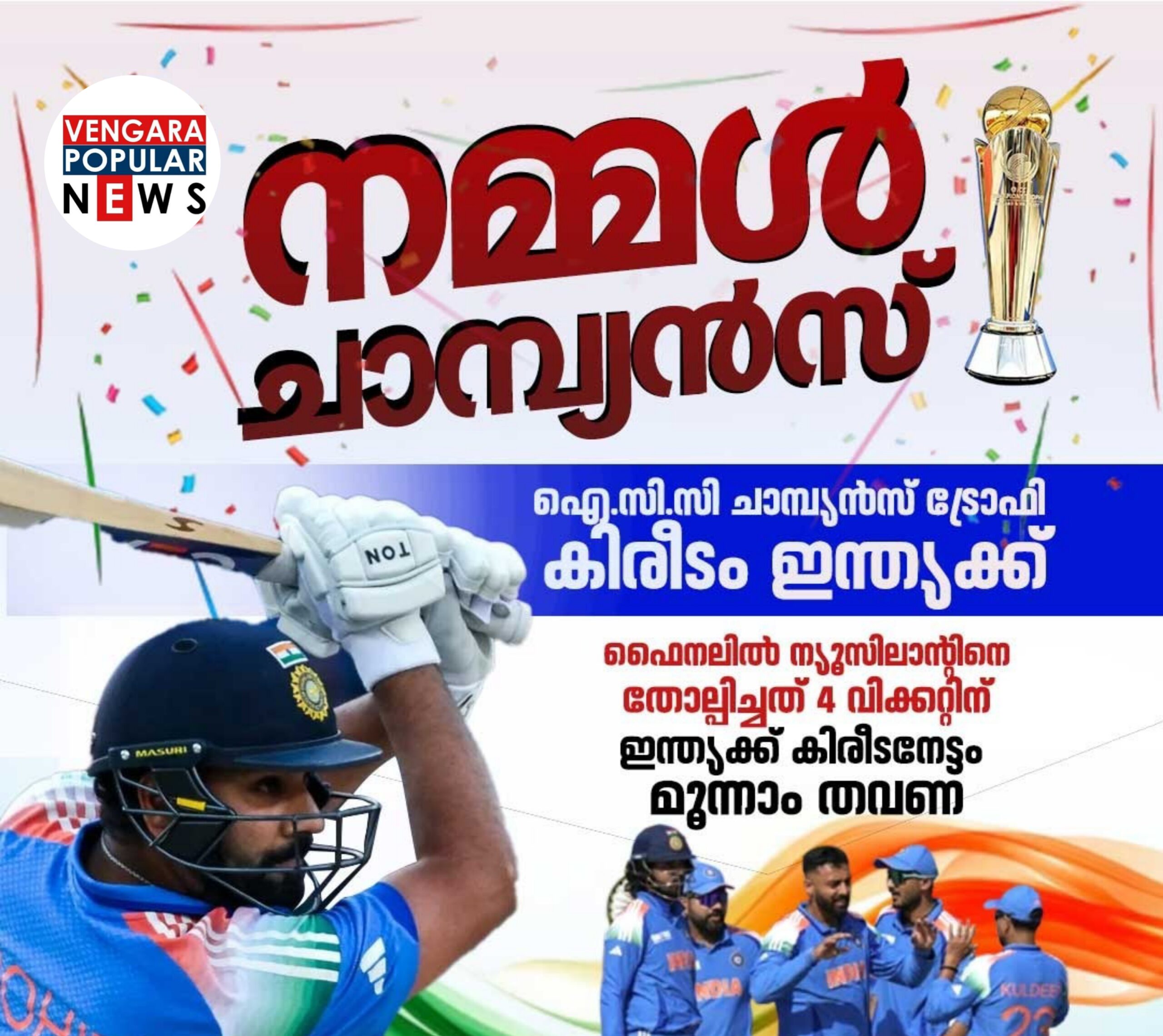 ചാംപ്യൻസ് ട്രോഫി കിരീടത്തിൽ ഇന്ത്യൻ മുത്തം. മിച്ചൽ സാന്റ്നറിനേയും സംഘത്തിനേയും നാല് വിക്കറ്റിന് ഇന്ത്യ തോൽപ്പിച്ചു. 252 റൺസ് വിജയ ലക്ഷ്യം പിന്തുടർന്ന ഇന്ത്യ ആറ്
