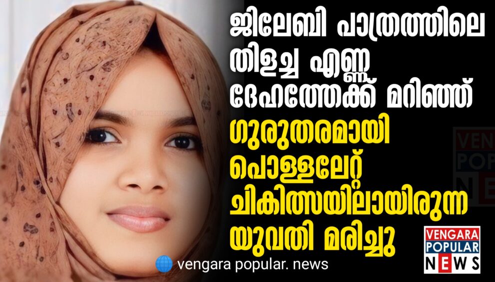 # Tags വിവാഹ മണ്ഡപത്തിൽ ജിലേബി തയ്യാറാക്കുന്ന ടേബിളിന്റെ കാലിൽ തട്ടി ജിലേബി പാത്രത്തിലെ തിളച്ച എണ്ണ ദേഹത്തേക്ക് മറിഞ്ഞ് ഗുരുതരമായി പൊള്ളലേറ്റ് ചികിത്സയിലായിരുന്ന യുവതി മരിച്ചു. Admin 1 / 9 months 0 1 min read