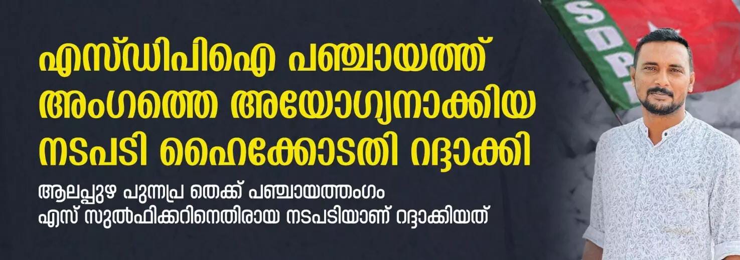 കൊച്ചി: തുടർച്ചയായി യോഗങ്ങളിൽ ഹാജരാവുന്നില്ലെന്ന് ആരോപിച്ച് എസ്ഡിപിഐ പഞ്ചായത്ത് അംഗത്തെ അയോഗ്യനാക്കിയ നടപടി ഹൈക്കോടതി റദ്ദാക്കി. ആലപ്പുഴ പുന്നപ്ര തെക്ക് പഞ്ചായത്തംഗം എസ് സുൽഫിക്കറിനെതിരായ നടപടിയാണ് ജസ്റ്റിസ്