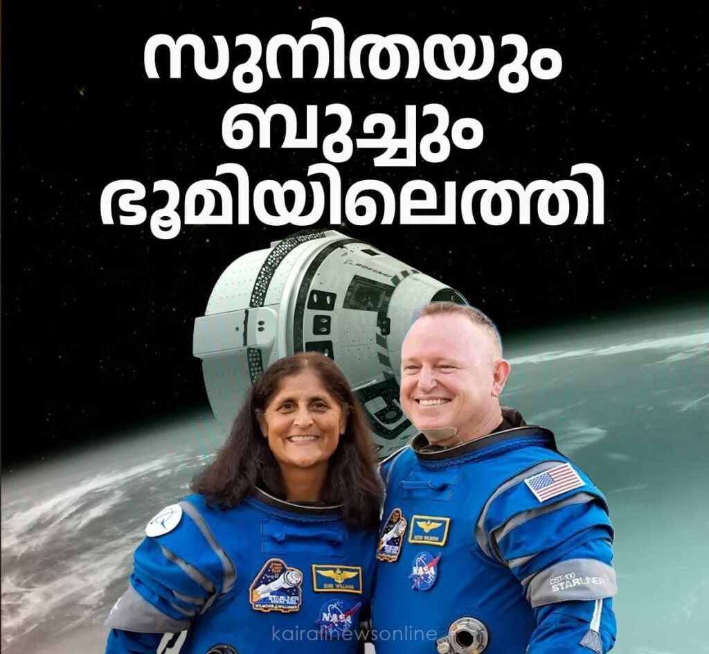 വെറും എട്ട് ദിവസത്തെ ദൗത്യത്തിനായി പുറപ്പെട്ട്, അവസാനം ഒൻപത് മാസം അന്താരാഷ്ട്ര ബഹിരാകാശ നിലയത്തിൽ കഴിയേണ്ടി വന്ന സുനിത വില്യംസും ബുച്ച് വില്‍മോറും ഒടുവിലിതാ ഭൂനിയിൽ തിരിച്ചെത്തിയിരിക്കുകയാണ്. ഇന്ത്യന്‍സമയം ബുധനാഴ്ച പുലര്‍ച്ചെ 3.27ന് മെക്‌സിക്കോ ഉള്‍ക്കടലിലാണ് ഡ്രാഗണ്‍ പേടകം സുരക്ഷിതമായി ലാന്‍ഡ് ചെയ്തത്. പേടകത്തിനുള്ളിൽ ഉണ്ടായിരുന്ന നാല് യാത്രികരേയും കപ്പലിലേക്ക് മാറ്റി. സ്ട്രെച്ചറിലാണ് ഇവരെ മാറ്റിയത്. അതിനുമുന്‍പ് ഒരുനിമിഷം അവരെ നിവര്‍ന്നുനില്‍ക്കാന്‍ അനുവദിച്ചിരുന്നു. സുനിത വില്യംസുള്‍പ്പെടെ എല്ലാവരും ക്യാമറയിലൂടെ ലോകത്തെ അഭിവാദ്യം ചെയ്യുകയും ചെയ്തു.